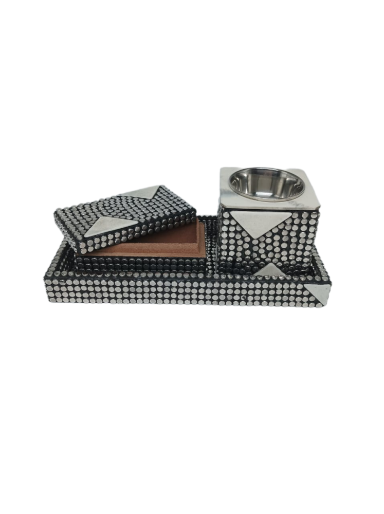 أضف لمسة من الرقي والأصالة إلى منزلك مع طقم مبخرة فاخر بلونه الفضي الأنيق المصنوع يدويًا باحترافية تضيف جمالًا خاصًا لكل ركن في بيتك فهذا الطقم ليس مجرد أداة لحرق العود بل هو قطعة فنية تعكس ذوقك الرفيع واهتمامك بالتفاصيل.